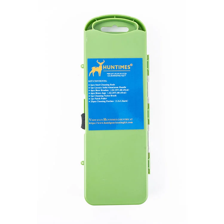 Наш набір для чищення калібру 9MM/.357/.38/.40/.44/.45, розроблений для вашого пістолета, має спеціалізований логотип і упаковку рукоятки OEM. Цей універсальний набір для чищення ідеально підходить для любителів полювання та поставляється з набором аксесуарів, адаптованих до ваших конкретних потреб. У набір входять два латунні стрижні для чищення, міцна пластикова ручка, нейлонова щітка для чищення, двадцять п’ять чистячих патчів, чотири камерні щітки різного калібру, чотири латунні зубці, пластиковий патч-знімач і латунний патч-знімач.
